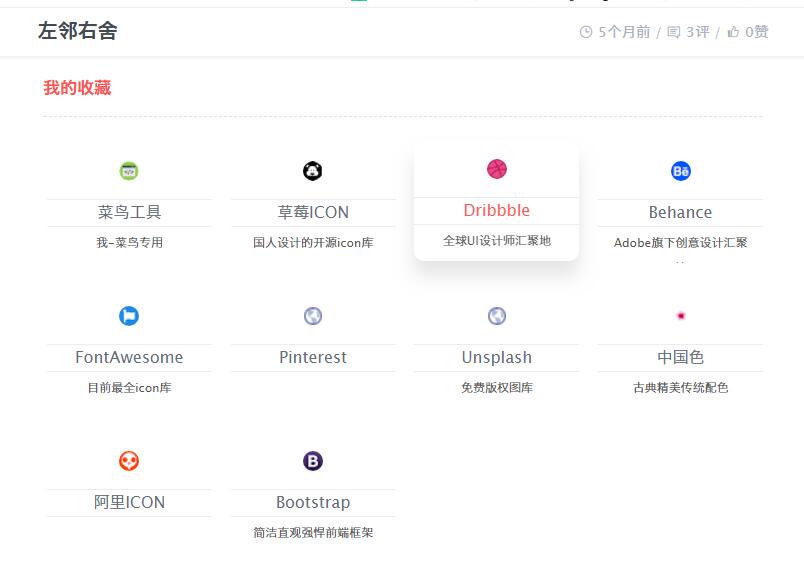 之前友链页面的链接比较少,所以使用Post来存放。但随着“我的收藏”的链接数增加,使用Post的方式就会变成一种体力活,难免会心生乏味。于是我晚上用“自定义页面模板”方式,重新生成了有个性的友链页面。新的「左邻右舍」采用渐隐悬浮效果,主要由「网站favicon+网站名称+网站Slogon」构成,具体效果对比如下: