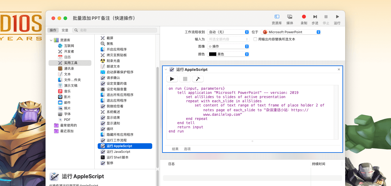 然后在左栏选择「运行 AppleScript」,拖入右侧空白处,在新出现的编辑框中输入图中代码,然后将流程设置为仅在 Microsoft PowerPoint 中生效即可: