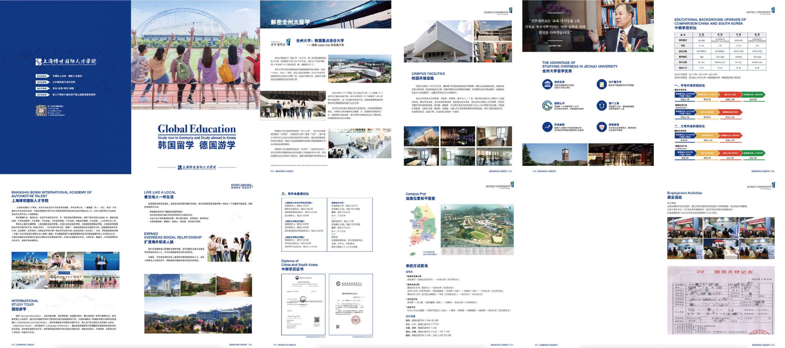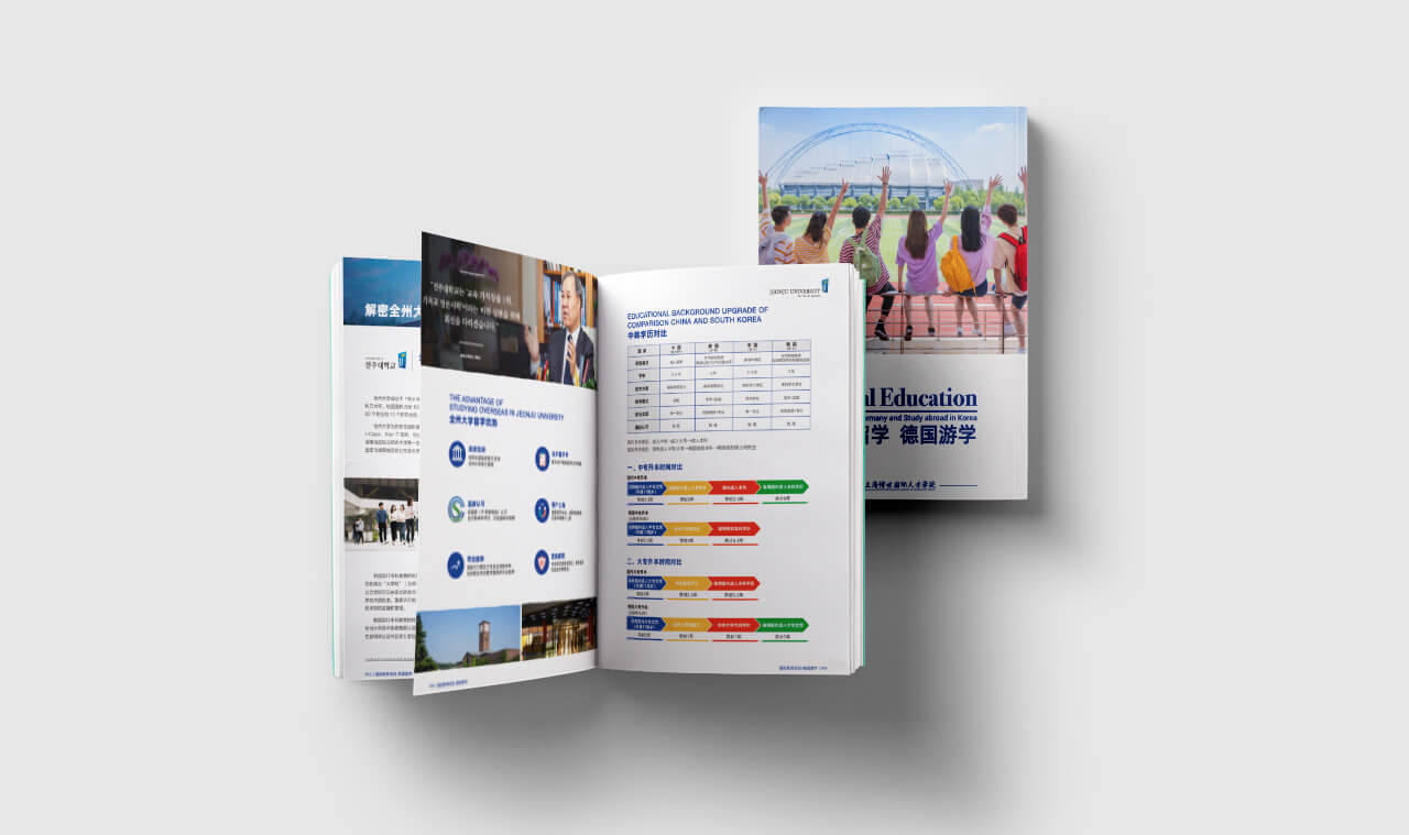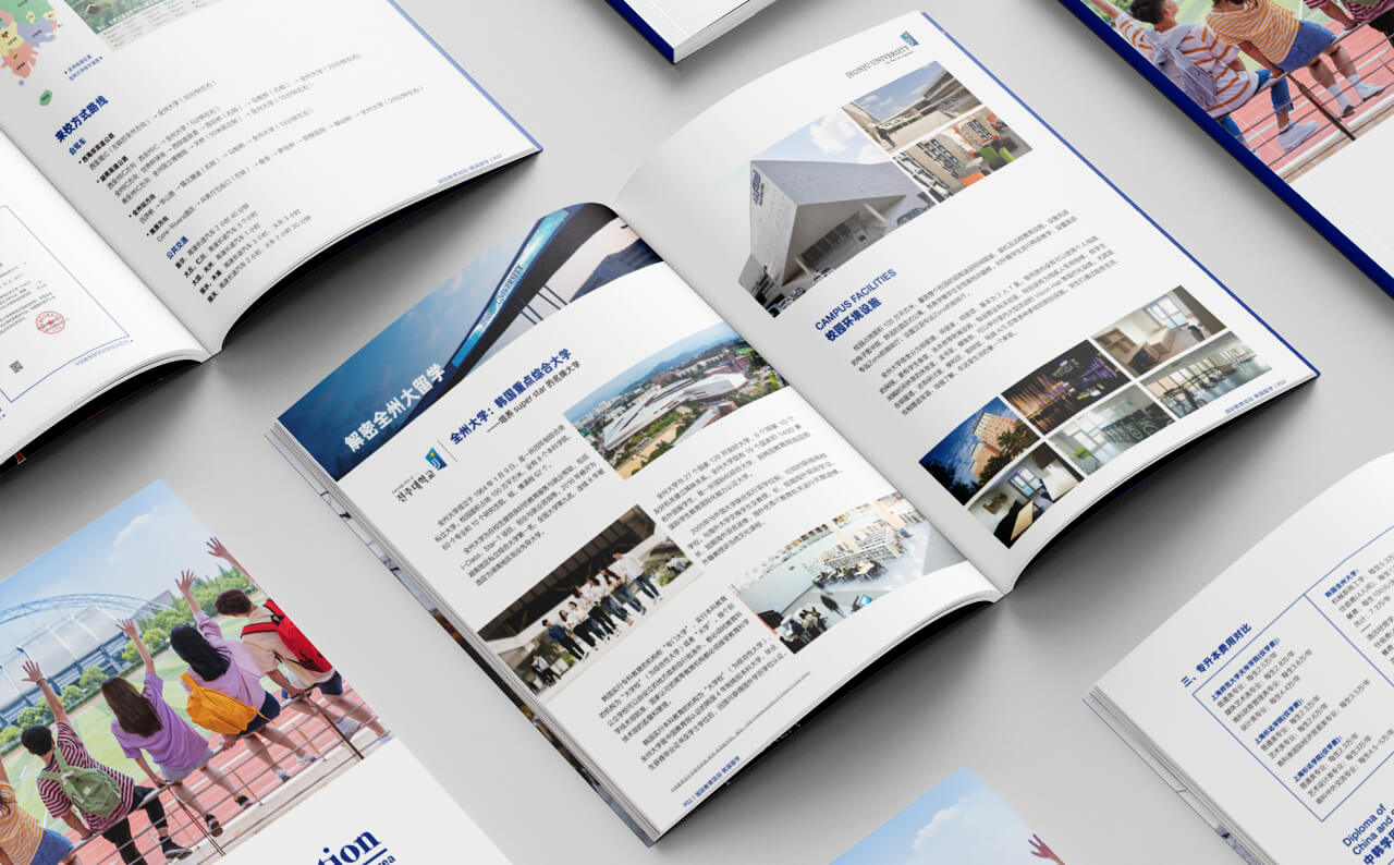 留学手册设计录 JiuGoe 2020-07-16 0 项目背景 接到项目需求大概是19年12月底,当时还没有资料,只提到来年计划上线留学研学项目,学校为韩国全州大学。但好巧不巧,除夕前开始出现新冠疫情的苗头,原本计划2月初上班复工也被一延再延,直到3月中旬才回到单位进行自我隔离。通过「全州大学官网」和「全州大学百科」对全州大学的大概了解后,5天里设计完初版内容。可惜疫情爆发得愈加严重,最终只能暂时搁置这个项目。 项目资料及参考 给到的项目资料是14页的PPT一份,外加9张图和全州大学的logo。 画册初版展示