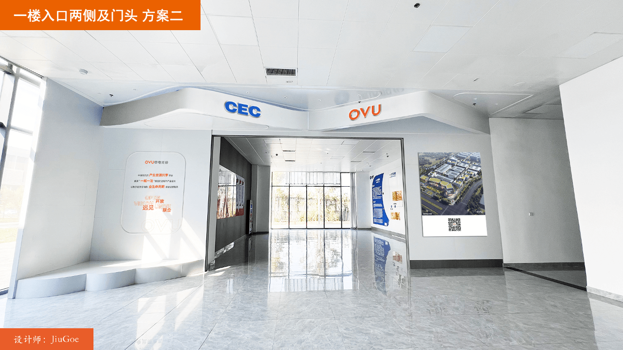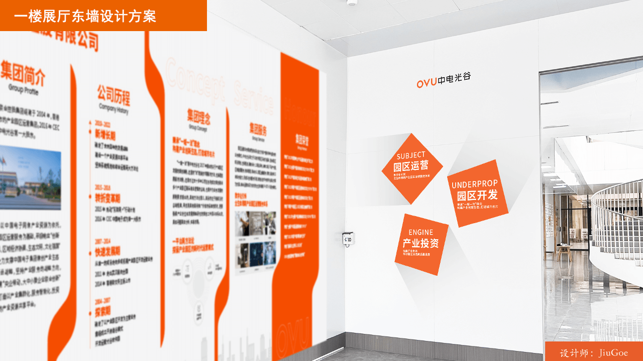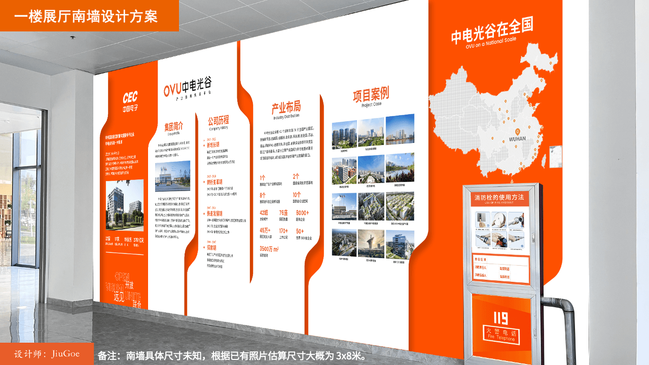 对于初次到访的人来说,「中国电子」或「CEC」是非常重要的元素,设计时其存在的逻辑顺序和位置都需要考究。版面多容易喧宾夺主,不给版面又起不到背书的作用。因此改造方案设计时,我让「中国电子」的信息和「中电光谷」的信息处于不同平面,错落有致。