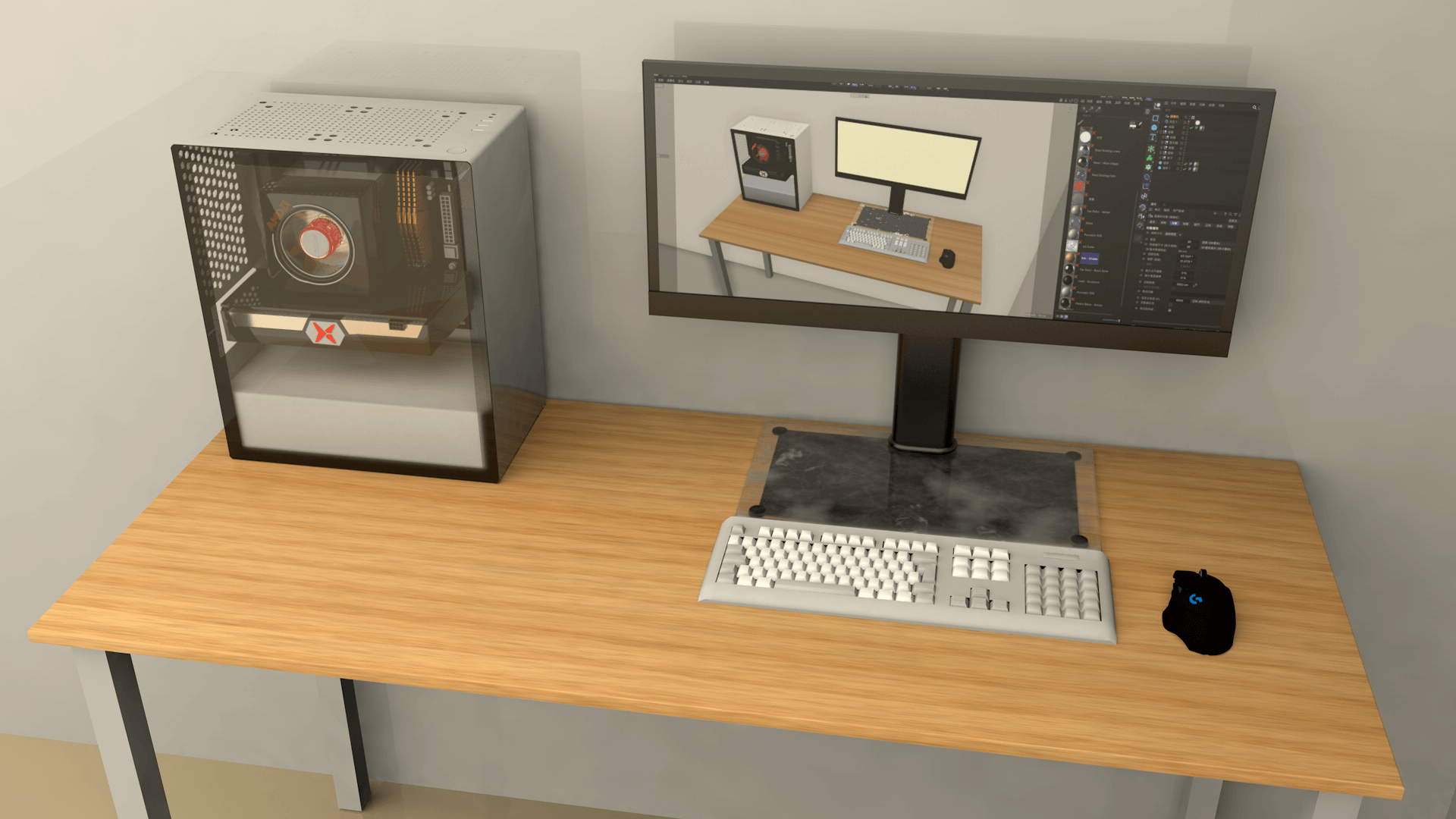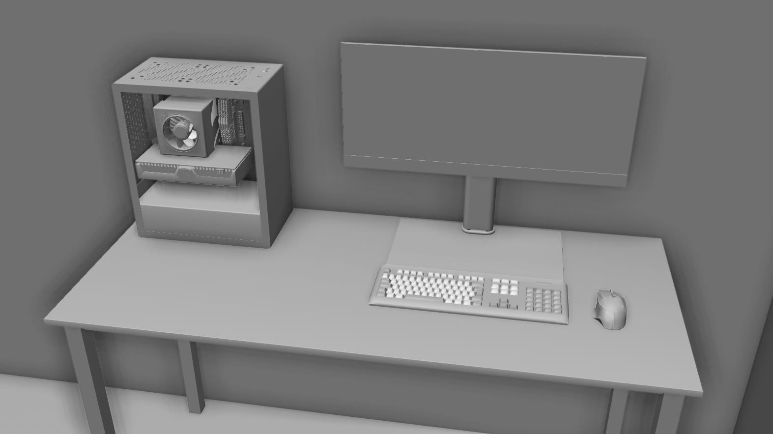 这一周在搭建自己的桌面主机,不知是不是 CPU 性能跟不上,机箱顶部和背部的通风孔道,布尔长达2分钟,最终渲染花费40分钟,目前只能搭建成这样的半成品。机箱内线束和主板上的元器件都没建,内部细节比较少,后面再完善了。显卡有等于没有,即便换大概率也是A卡,只能期待一手明年对A卡支持的渲染器了。