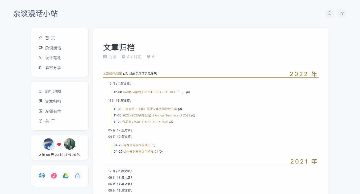 我探索过很多小众功能,有实用的、也有毫无用处的。但文章归档页一直隐蔽在角落里,未曾重视过。想赶在2022的尾巴上,整个不一样的归档页出来,好在有需求就有检索目标,有目标就有一定会有雏形,方案代码出自 @zwwooooo 的《WordPress 归档页面模板2014版》,样式根据自己的需求重写了。最终效果如图: