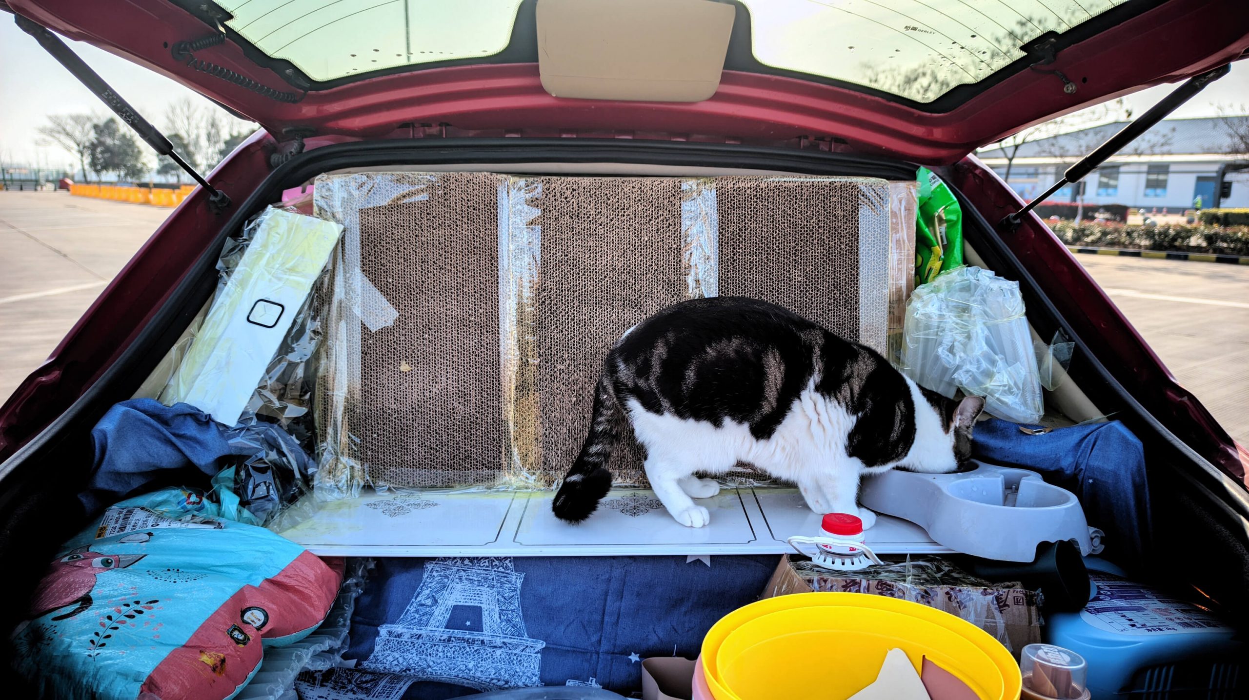 东西比较多,年前花了两天时间打包装车。后排放倒后备箱有1350L空间,光铃铛的空间就占三分之一,剩下就是电脑、两行李箱和一些书之类的。装车之前我还挺头大的,怕铃铛窜到前排驾驶位,后来猫抓板用透明胶粘行李箱上,然后横放立着,刚好能挡住。一切装车妥当,就待择机出发了。