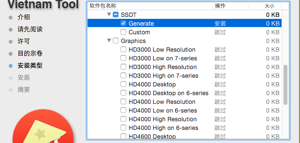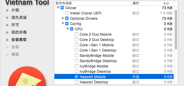 这一步主要用到的软件是Hackintosh Vietnam Tool 1.7.8,不同架构处理器[比如Sandy Bridge、Ivy Bridge、haswell]的请灵活运用此工具。第四代haswell处理器具体设置: