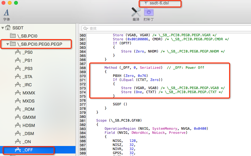 这个方法实施的必要条件是你的显卡信息里必须要包含有如下图的 关闭显卡的函数\_SB.PCI0.PEG0.PEGP._OFF。比如我的显卡信息在SSDT4、5、6中,而我的SSDT-6中本身有这个函数。所以这个方法才可行~