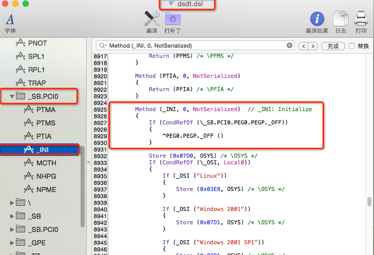 有了这个条件怎么做?找到DSDT中关于显卡信息的\_SB.PCI0._INI,把以下的这段代码直接添加到它的Method (_INI, 0, NotSerialized)后面,然后在DSDT顶部同样的添加调用External(\_SB.PCI0.PEG0.PEGP._OFF, MethodObj)