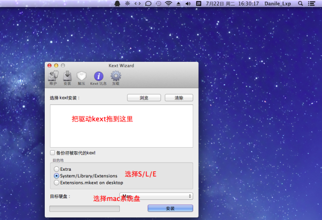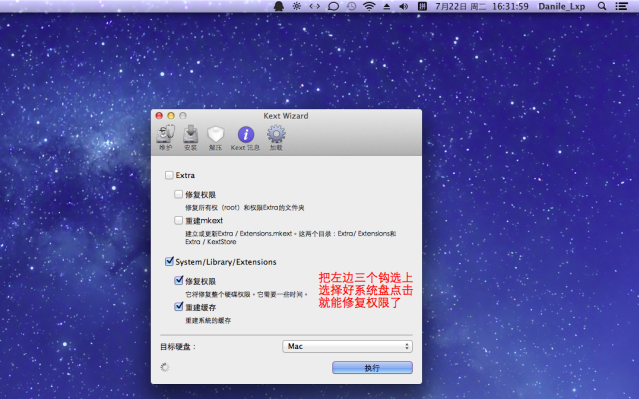 下载好触摸板驱动后,用驱动安装神器Kext Wizard 安装到S/L/E下面,然后修复权限。重启后你会发现可能还是无法使用,再重新安装一次即可!