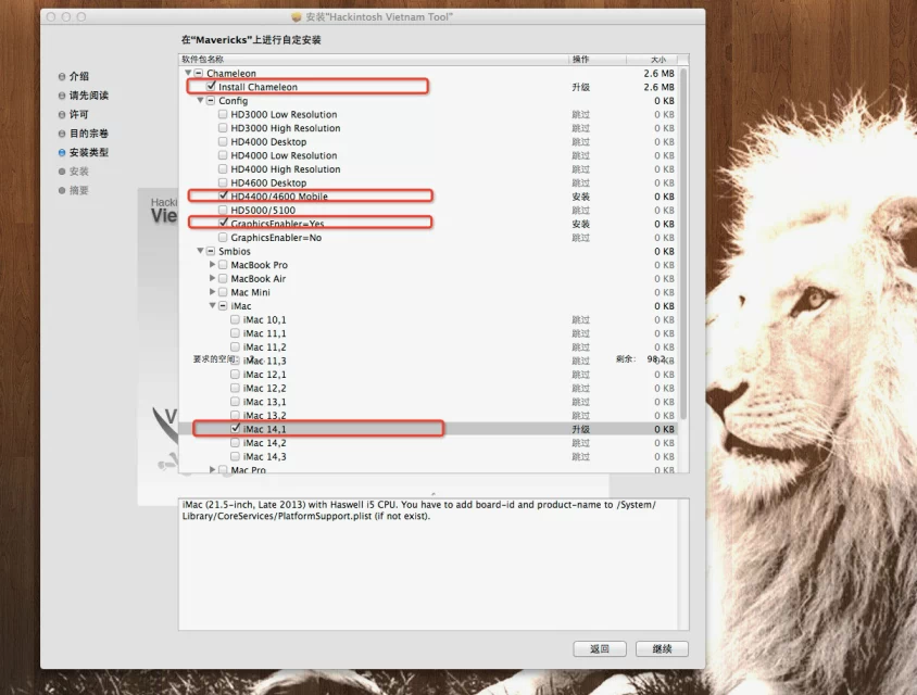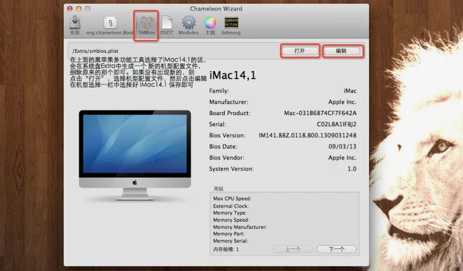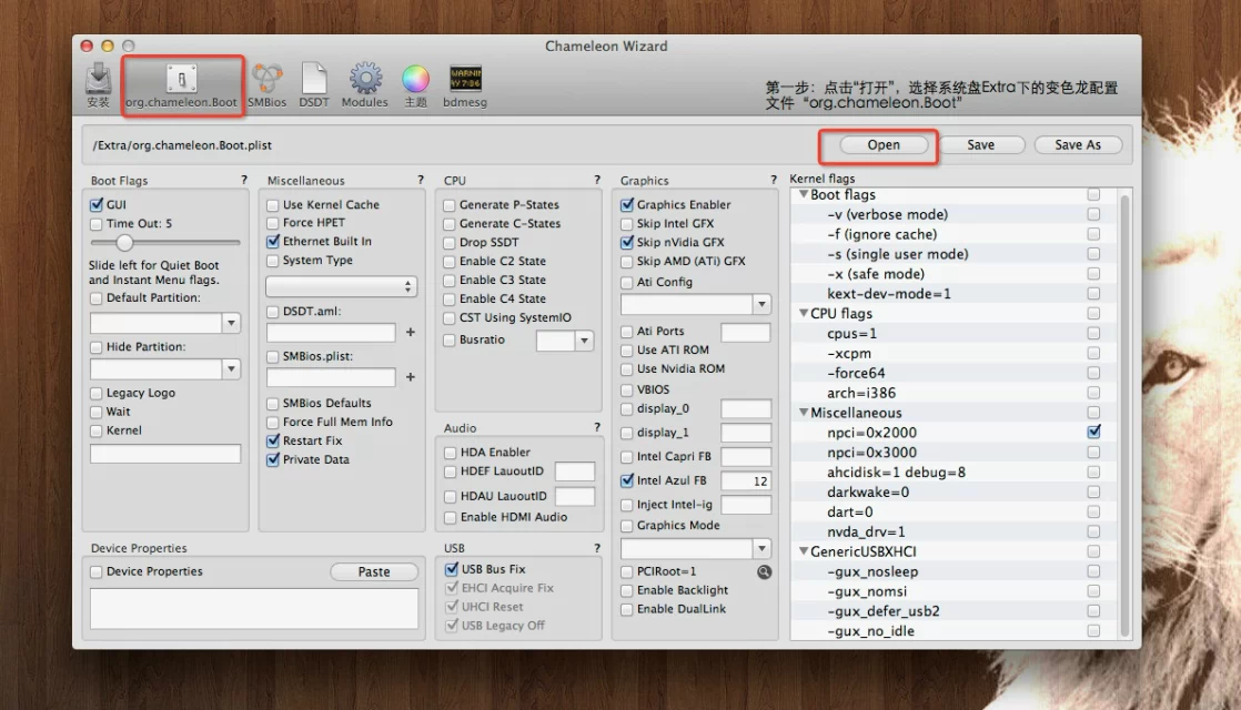 点击安装完成后,会在桌面生成一个工具包。打开Chameleon Wizard ,点击第二部分org.chameleon.Boot,打开系统盘的相应文件, 具体配置按照下图。