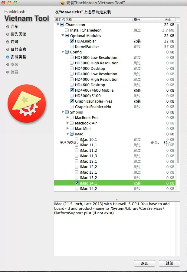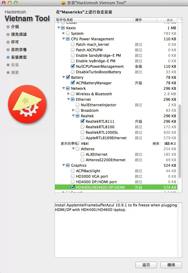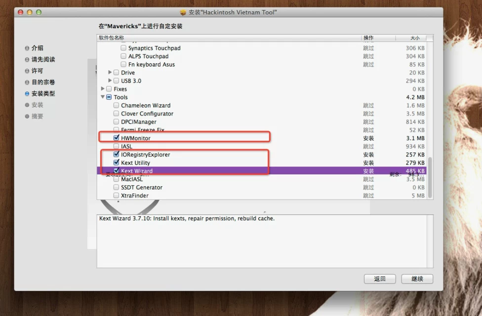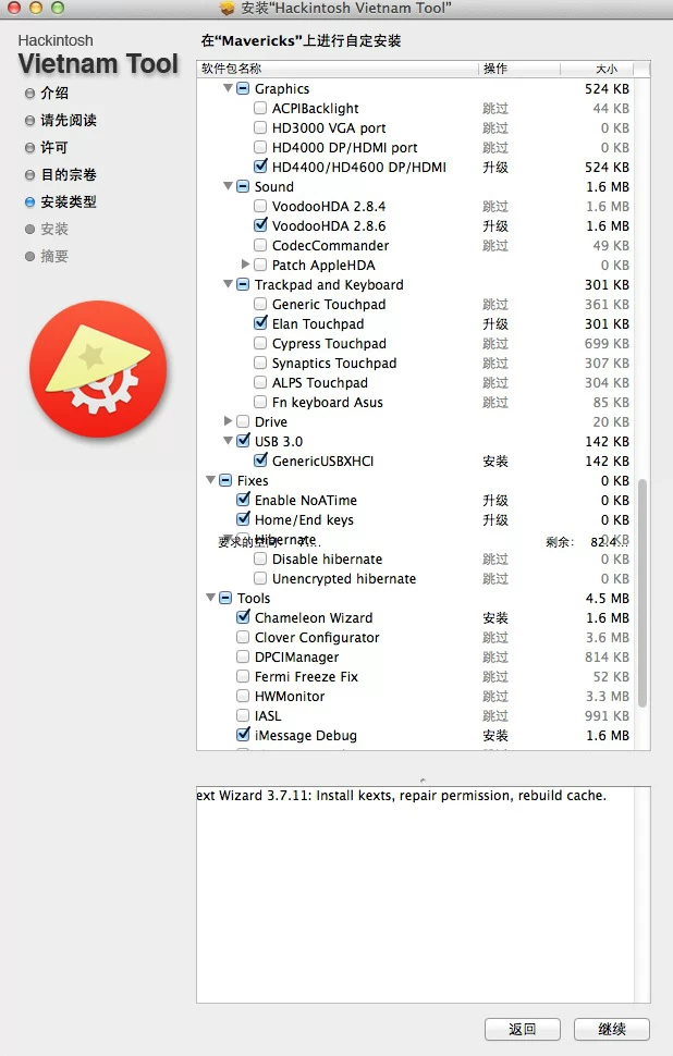 首先安装Hackintosh vietnam tool,这是一个集合了系统工具和驱动为一身的综合配置工具。这个工具覆盖了引导工具、CPU电源管理、显卡、电池、音频、有线网卡、无线网卡、触控板、USB3.0 驱动及补丁,还包括很多其他实用工具。使用这个工具的原则是:尽量少选,不知道的不选!这和我前面讲的一样,我们首先以系统能正常使用为前提去完善黑苹果,而不是为了完善而完善!