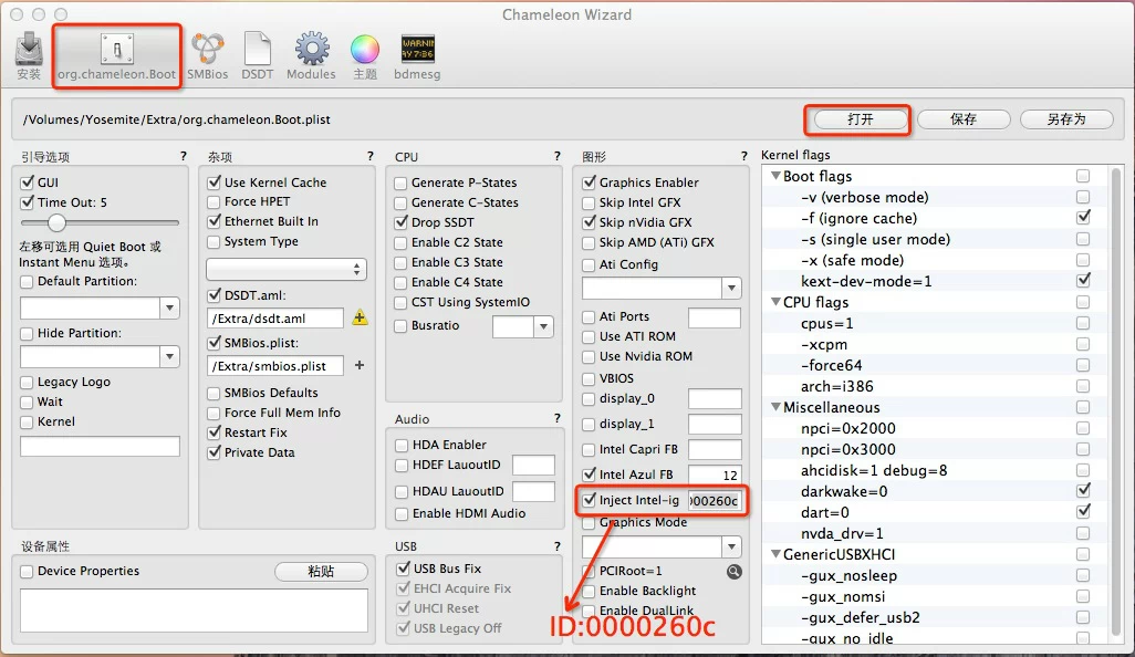 2、替换破解内核和Extra文件夹以及修改变色龙配置文件注入显卡ID这些都和前面一样,没有任何变化。