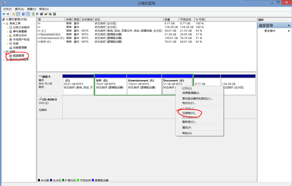 安装盘制作:右键点击我的计算机——管理——磁盘管理,进入磁盘分区界面,然后找一个比较大的盘,右键选择压缩,输入8G的大小,选择盘符(我的为H),不格式化,这样就做好了OS X的安装盘;
