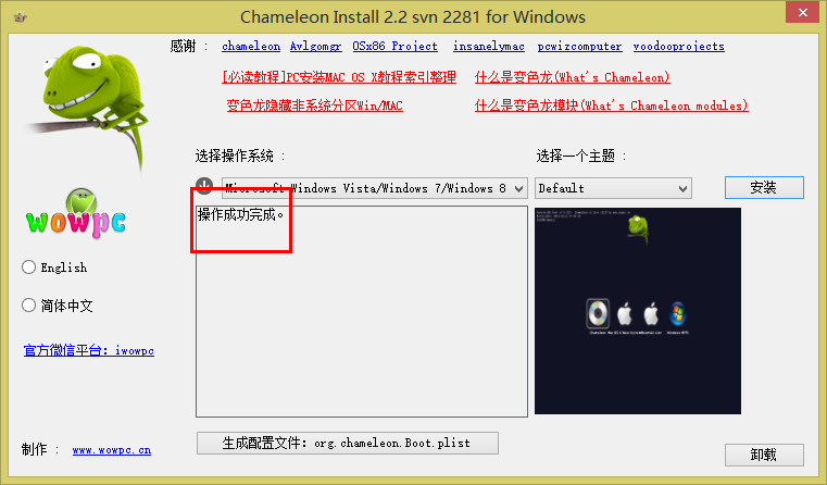 1、将附件变色龙Chameleon+Install+2281解压后,以管理员身份运行Chameleon Install.exe,选择你目前的windows系统(我的win8.1),选择好变色龙主题(我选了Lion),然后点安装就行,成功了会提示“操作成功完成”的。